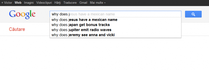 Treaba de mai sus am intalnit-o initial pe un site. Neincrezator in descoperirile astea am intrat pe google.ro si am tastat “why does j” si intr-adevar aparent cea mai cautata fraza este “why does jesus have a mexican name”. A fost un moment de revelatie in care m-am simtit ca tipul din povestea cu drobul …